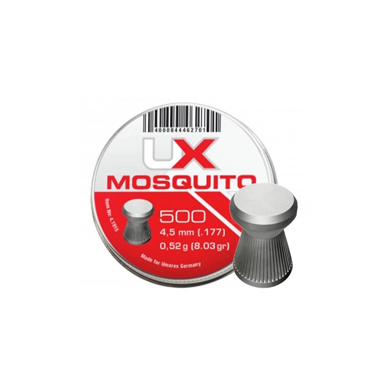 Lata de 500 balines UMAREX MOSQUITO del calibre 4.5mm. Plano y acanalado, la opción clásica para plinking, hobby shooting y pistola de CO2. Cumple todos los requisitos básicos de calidad y precisión. Inmejorable relación precio-rendimiento.