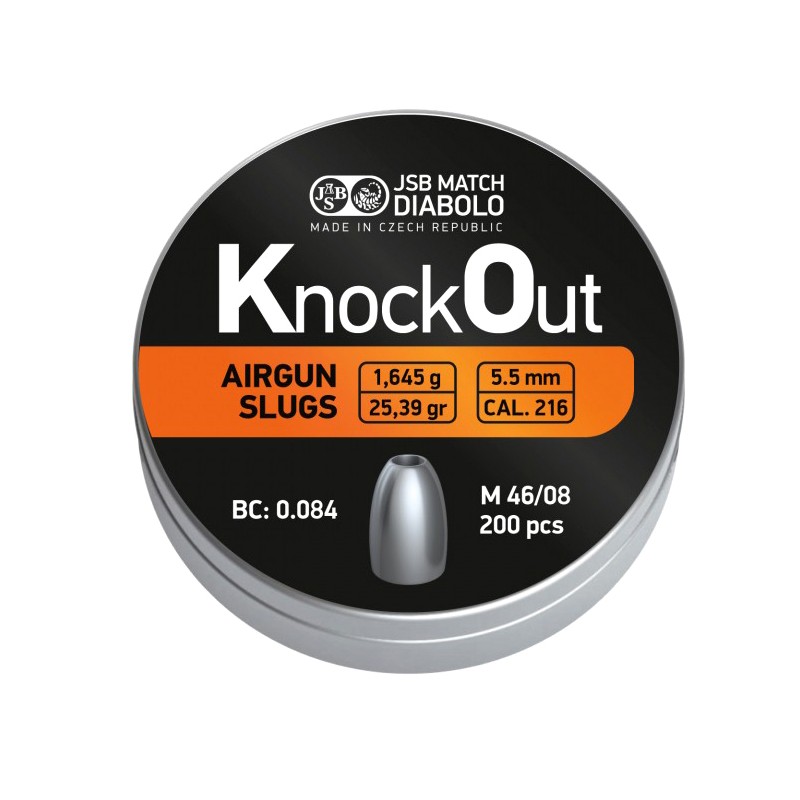 Lata de 200 balines JSB del calibre 5.5mm. Balines de plomo tipo slug punta hueca Modelo: JSB Knock Out Slug Calibre: 5.5 mm (.216) Diámetro: 5,49 mm Peso: 1,645 gramos / 25,39 grains Diseño: balín de plomo de punta slug Lata de 200 unidades Coeficiente Balístico 0.086