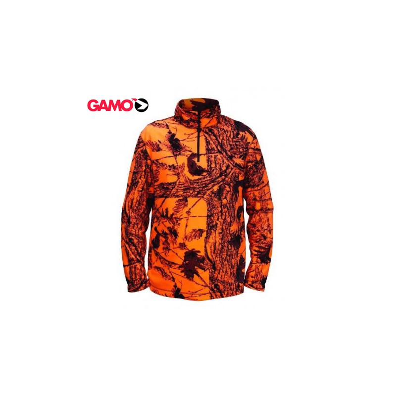 Polar Gamo Benasque en color Camuflaje Naranja de alta visibilidad. Polar tipo segunda piel, ligero, silencioso y de abrigo. Ha sido diseñado para retener el calor corporal en condiciones frías de caza estática.