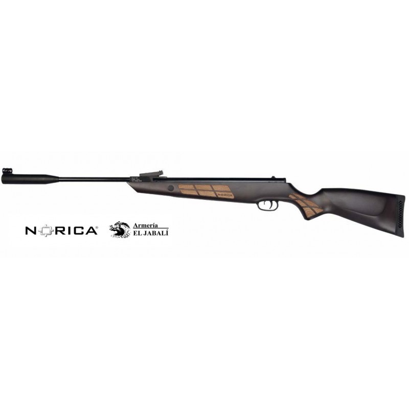 Carabina Norica Storm. Una de las creaciones más ambiciosas de la marca donde han empleado materiales de primera calidad como la madera de haya vaporizada con un acabado de excepción.Largo cañón: 454 mm Largo total: 1190 mm Peso 3,2 Kg. Velocidad cal 4.5 mm 315 m/s Velocidad cal 5.5 mm 265 m/s