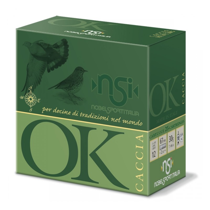 Cartuchos para caza de la marca Nobel Sport Italia modelo Ok en 30 gramos. Calibre 12/67