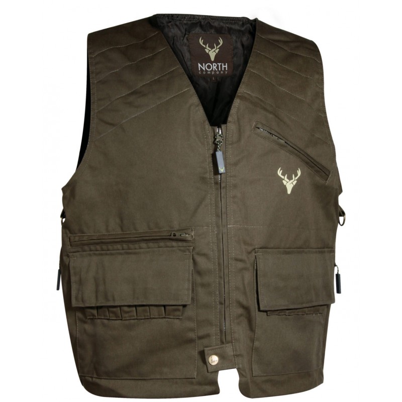 CHALECO TORCAZ de la marca NORTH COMPANY. Fabricado en loneta TC (65% Algodón/35% Poliéster) con recubrimiento de Teflón. 2 bolsillos cargo. 1 líneas de cananas en el exterior con tapeta. Doble morral trasero. Bolsillo con cremallera al pecho. Anillas portacaza en laterales.