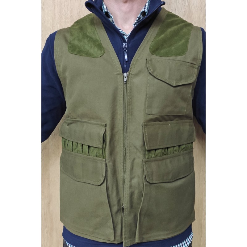 Chaleco de caza, estampado SELVA, ligero y resistente, 65% algodón, 35% polyester Pequeño bolsillo vertical con cremallera, pensado para albergar la documentación. Dos bolsillos con cremallera horizontales de gran capacidad. Doble cartuchera para 27 cartuchos. Peso 250 gr Tejido interior del morral PU impermeable.