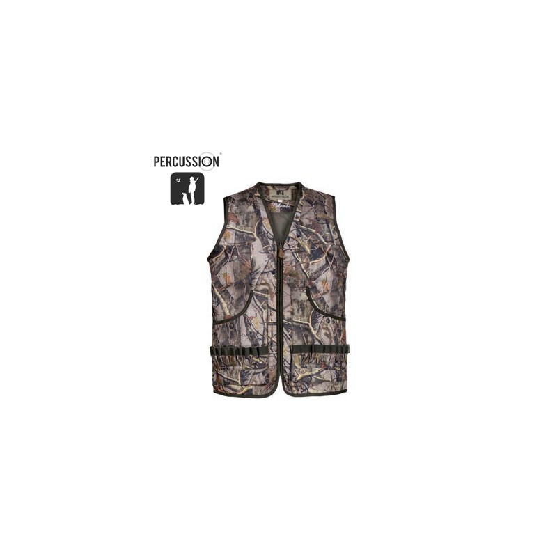 Chaleco de caza en camuflaje CON TRATAMIENTO HIDROREPELENTE: En tejido 80% poliéster y 20% algodón.