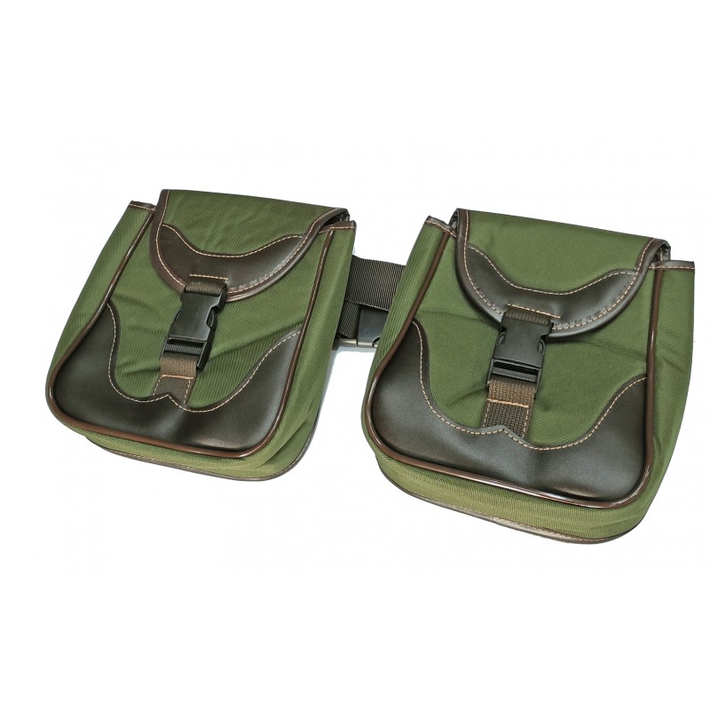 Par de bolsas de ojeo en color kaky y acabados en cuero, para transportar los cartuchos en los días de caza. Con cinturón adaptable y solapas de fácil apertura, ideal para caza ojeo y paso.