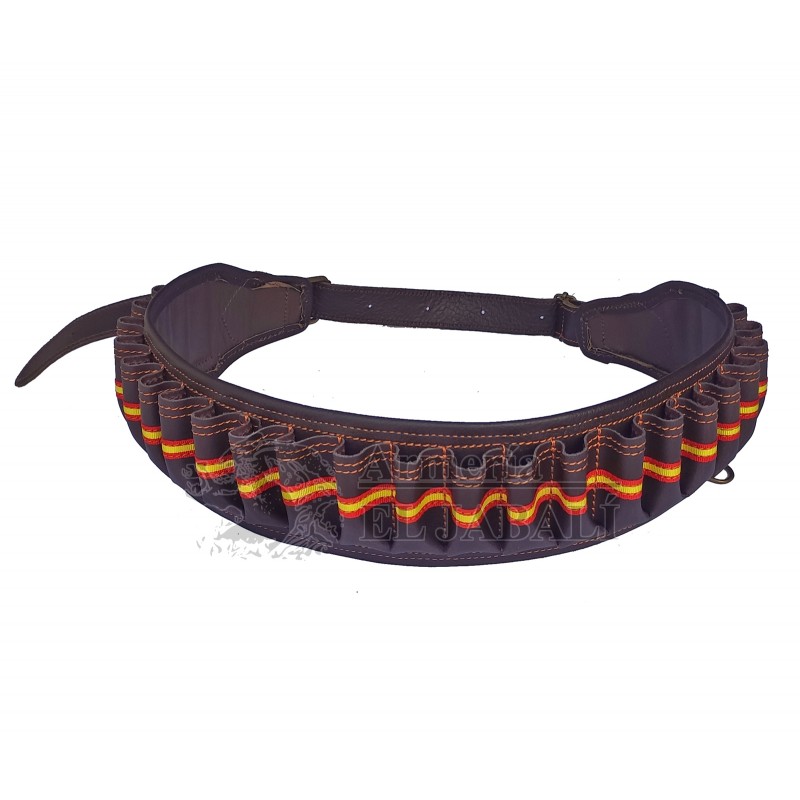 Canana para 25 cartuchos calibre 12 en piel cuero engrasado de gran calidad. Piel tratada de forma natural sin ningún tipo de agentes químicos. Longitud total: 130cm aprox