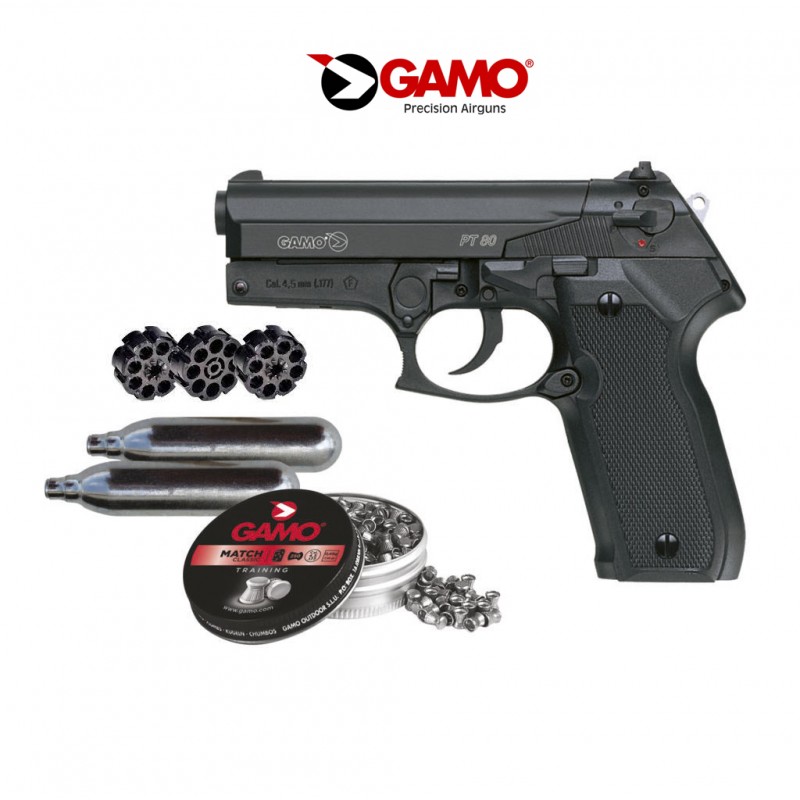 La pistola Gamo PT-80 de CO2 seguro que te sorprenderá, es de lo más divertida y fiable, una de las armas cortas con más tradición dentro del catálogo de Gamo con más de 20 años de historia. La Gamo PT-80 es una pistola de aire comprimido que dispara balines y que gracias a su cañón estriado su precisión es muy buena, dispone de un cargador clip giratorio con capacidad para 8 disparos, para acceder él tendremos que abatir la corredera hacia arriba. Esta configuración de cargador clip nos permite poder usar la pistola en modo semiautomático pudiendo disparar esos 8 balines en poco más de 1,5 segundo, pero también podemos prescindir del cargador y utilizar la pistola como una monotiro, alimentando cada balín uno a uno. Gamo PT-80, el mundo del aire comprimido en tus manos!